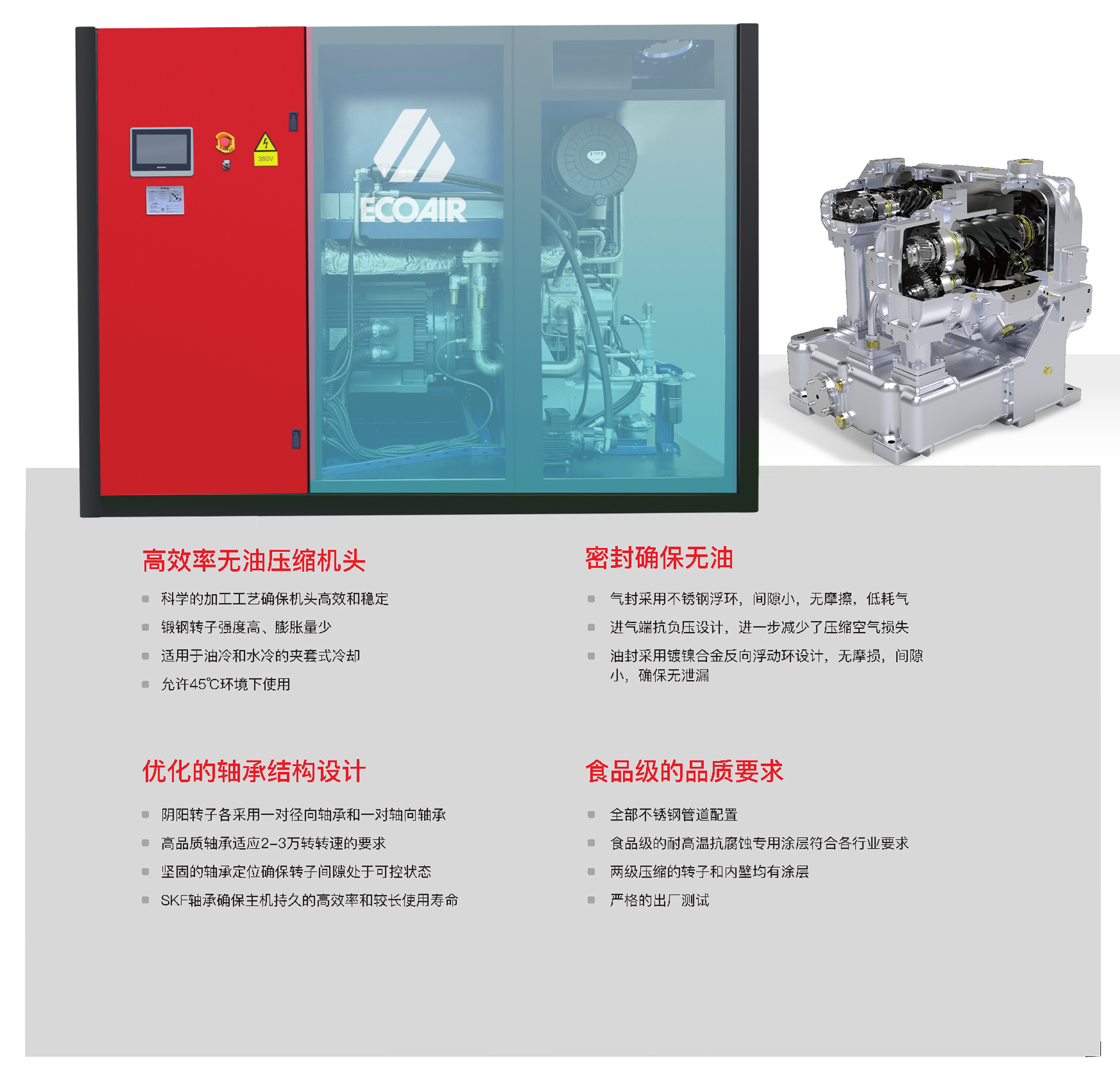 3.效率高無油壓縮機頭,好的長徑比專利螺桿型線,食品級耐高溫涂層。HMI智能控制系統;